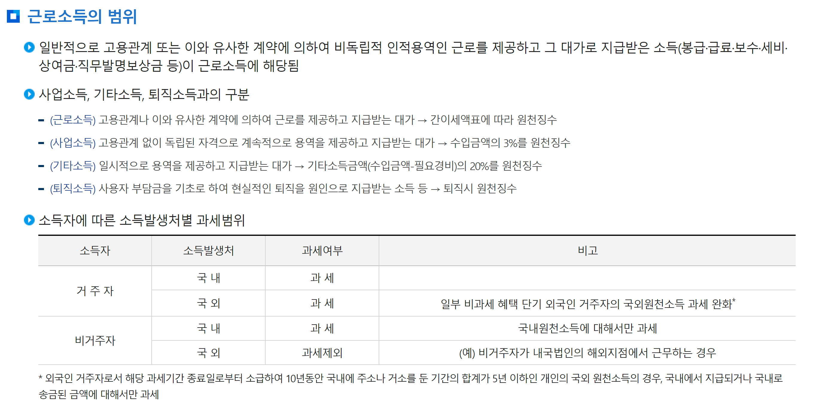 - 거주자의 경우 국내 및 국외에서 발생한 소득은 모두 과세 대상이며, 비거주자의 경우 국내에서 발생한 소득만 과세 대상입니다. 외국인 거주자의 경우 국내에 주소나 거소를 둔 기간이 5년 이하인 경우 국외 원천소득의 일부만 과세될 수 있습니다.