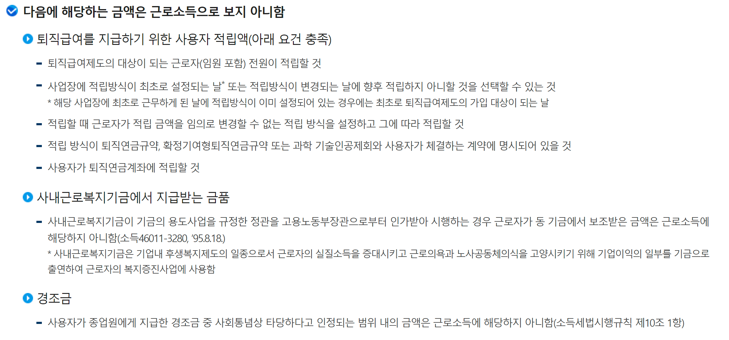 - 퇴직급여 외에도 근로자의 실질소득을 늘리기 위해 사용자가 근로자에게 제공하는 사내복지 혜택 등의 일부가 근로소득에서 제외될 수 있습니다.